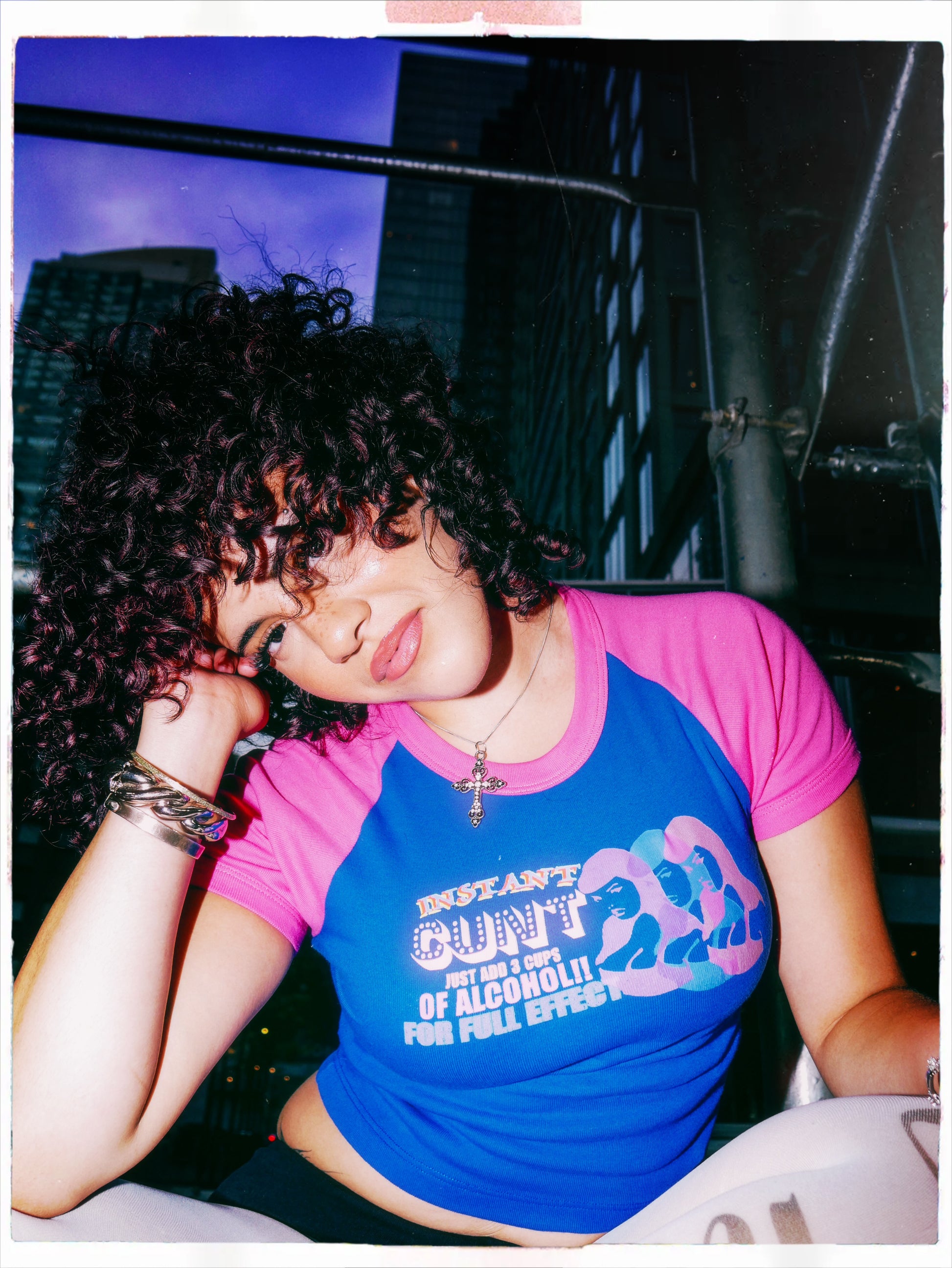 A cropped baby tee with contrasting raglan sleeves and a 3/4" binding finish. Our combed cotton baby rib is made of soft 30 singles yarn and stretches up to 2 times its original size. This 100% cotton style shrinks 7% in wash and this style has been designed to fit before and after wash.